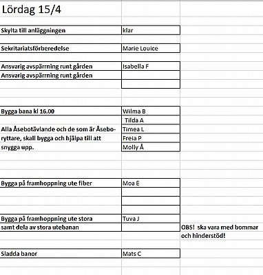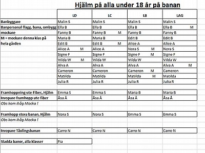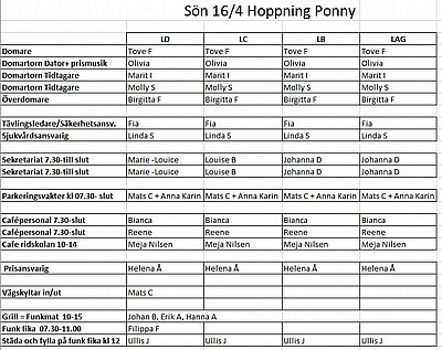 Härligt med alla duktiga funktionärer som anmält sig till söndagens hopptävling! Se funktionärslistan vad du har för uppgift vid vilken klass. Möte för er som skall vara på banan och framhoppningen kl 08.00 i Klubbis. Fika kommer att finnas hela dagen i Klubbis. Vi bjuder på hamburgare till alla som är funktionärer hela dagen. OBS! Kom ihåg att alla som ska tävla ska vara med och bygga bana på Lördag kl 16.00, men alla är välkomna att hjälpa till!