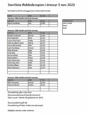 Här kommer startlistorna för Ridskolecupen i dressyr och teori på söndag 5/11.
