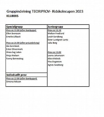 Teoriproven skrivs i klubbis, se vilken tid din grupp ska skriva provet under startlistan.