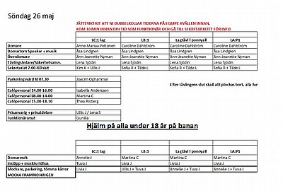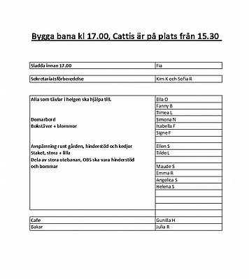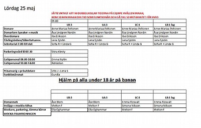 Här kommer helgens funktionärslistor. Alla som skall tävla skall komma och hjälpa till och bygga fram på fredag kl 17.00, Cattis är på plats från 15.30 om någon vill komma tidigare och hjälpa till.